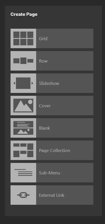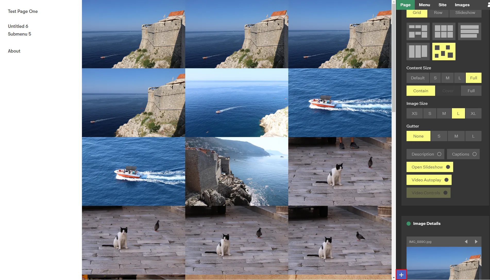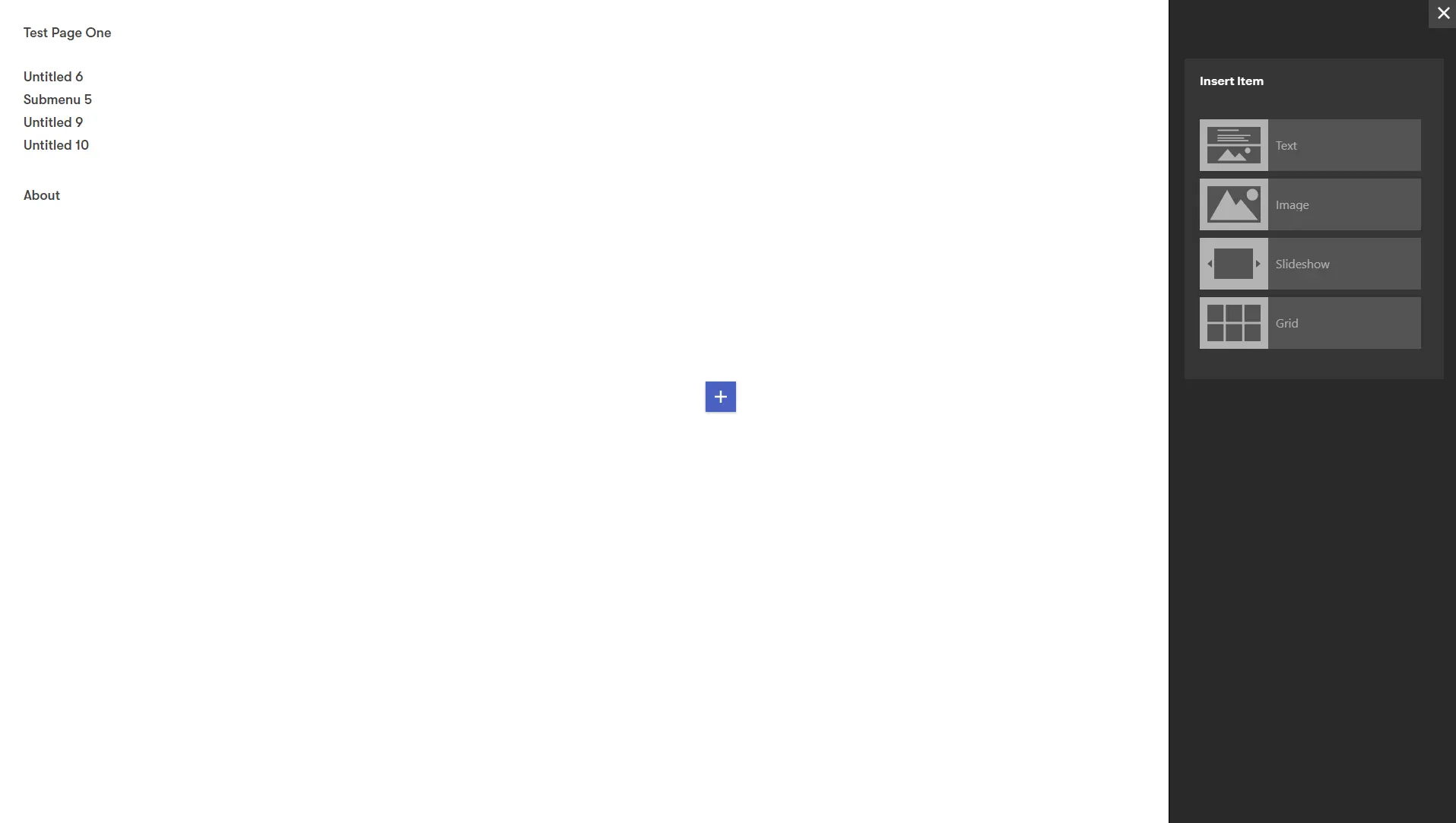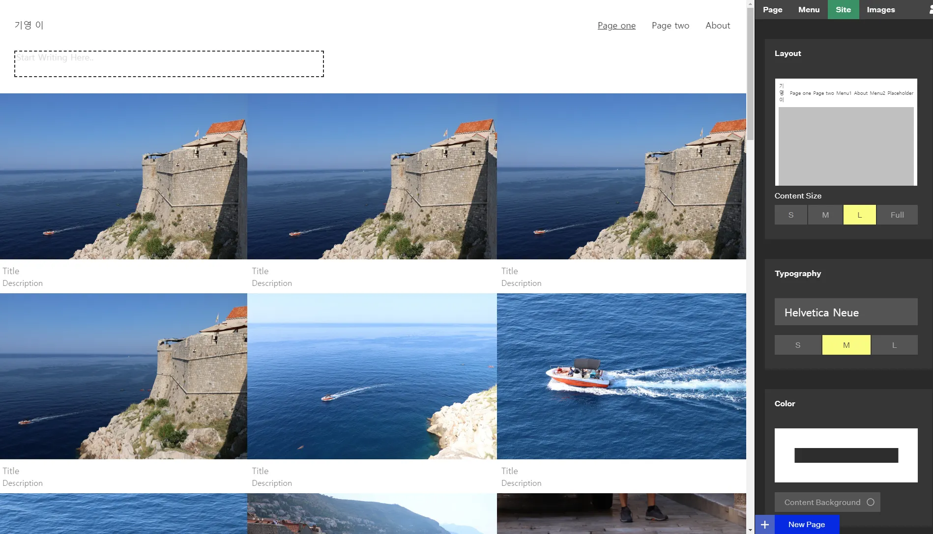 중앙에 위치한 + 버튼상자를 통해 텍스트, 이미지, 슬라이드쇼, 그리드를 추가할 수 있으며, 이후 아래 방향으로 텍스트, 이미지 등을 추가하여 페이지를 구성할 수 있습니다.