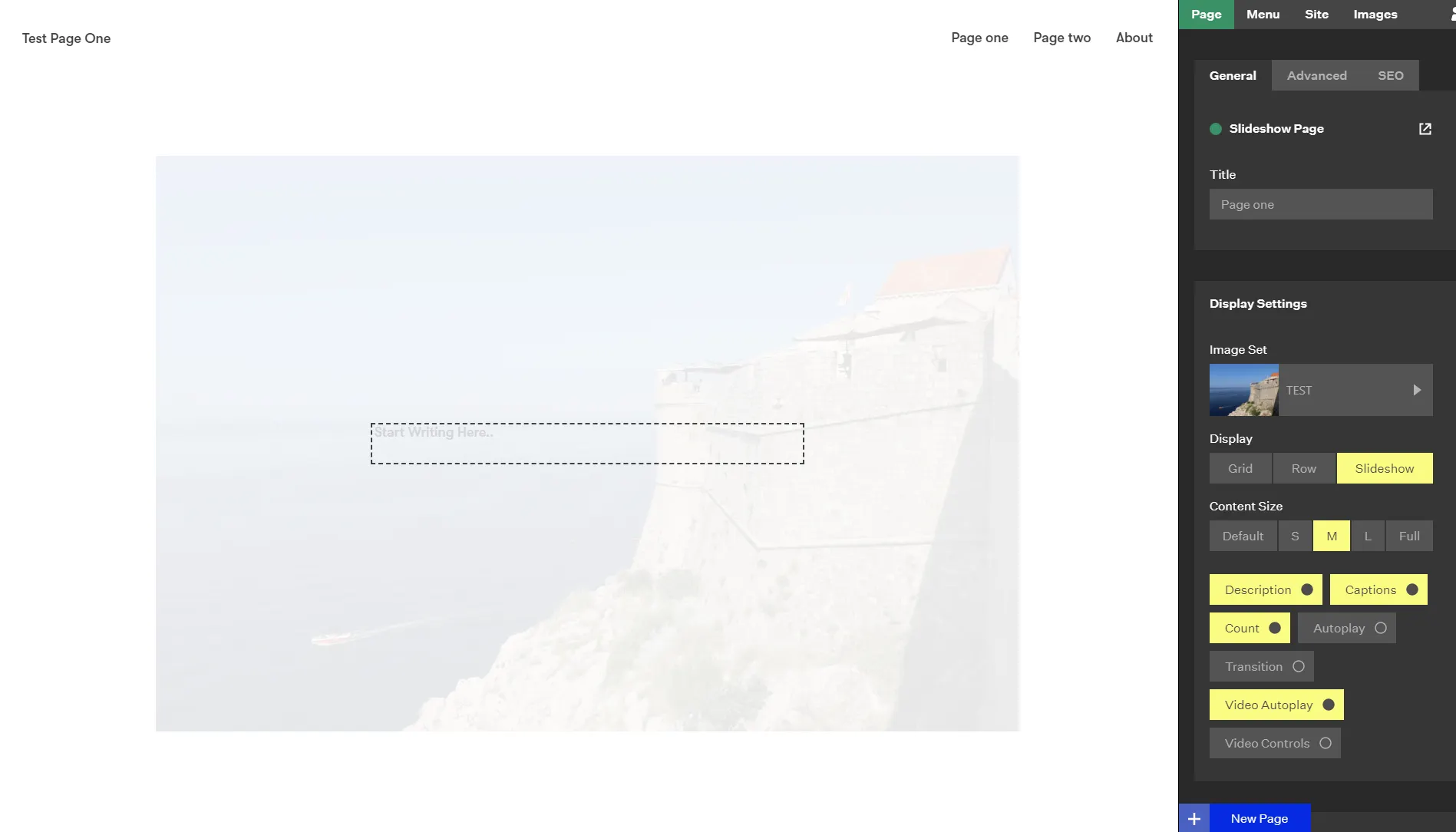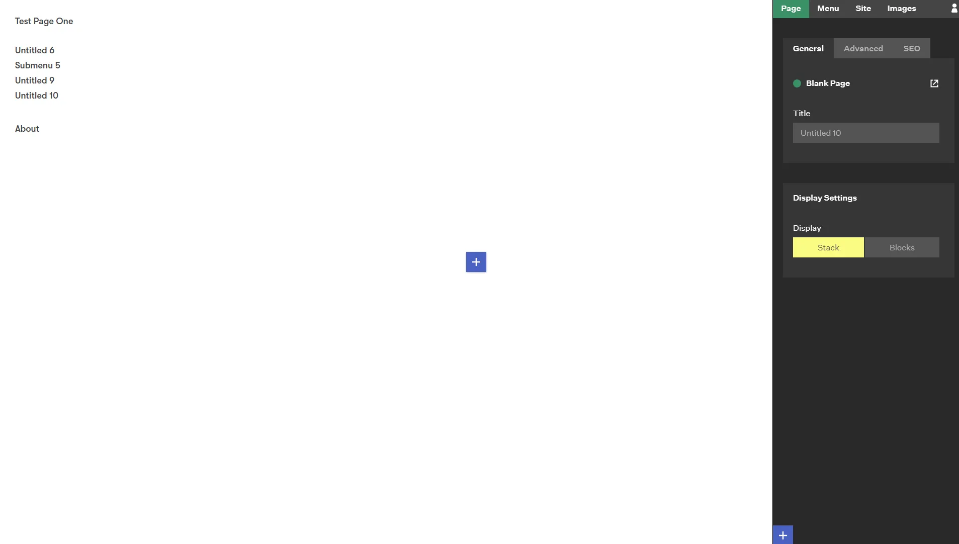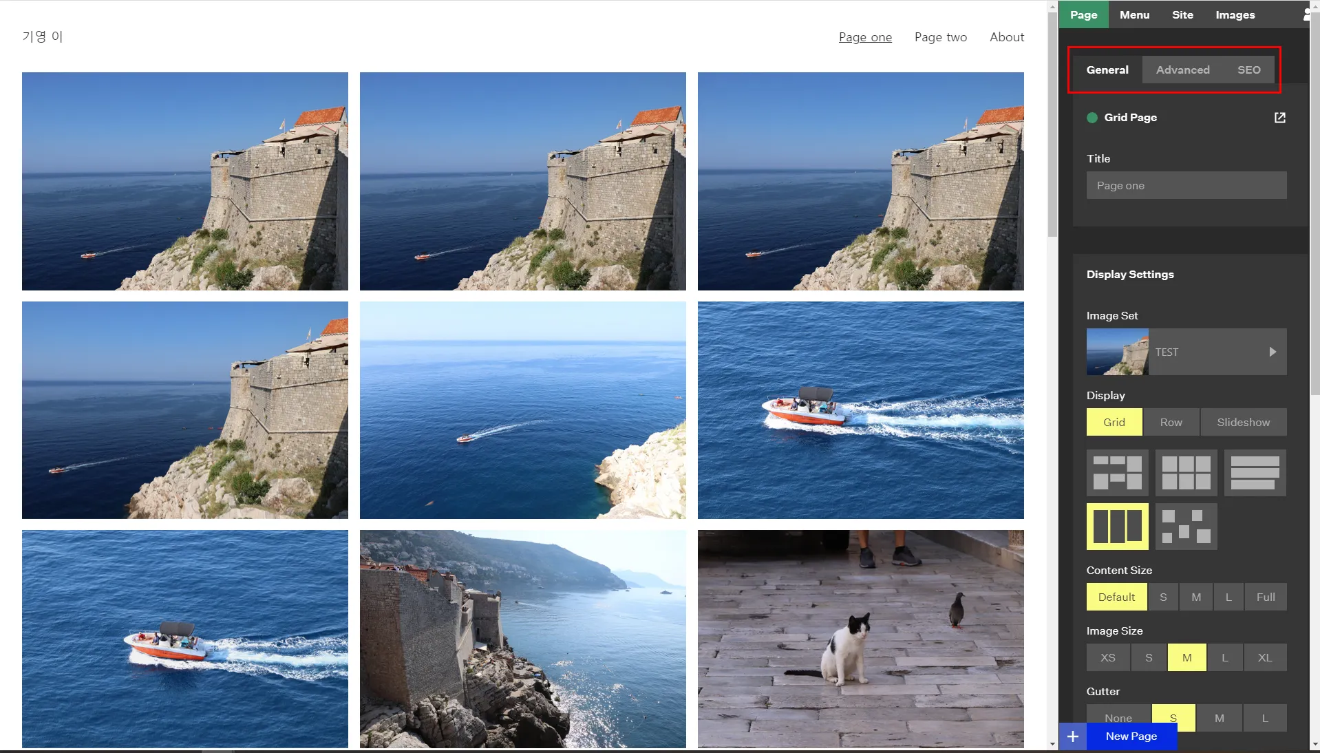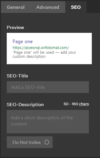 가장 상단에 위치하는 General, Advandced, SEO 항목은 페이지 타이틀과 접근 등에 관하여 설정합니다.