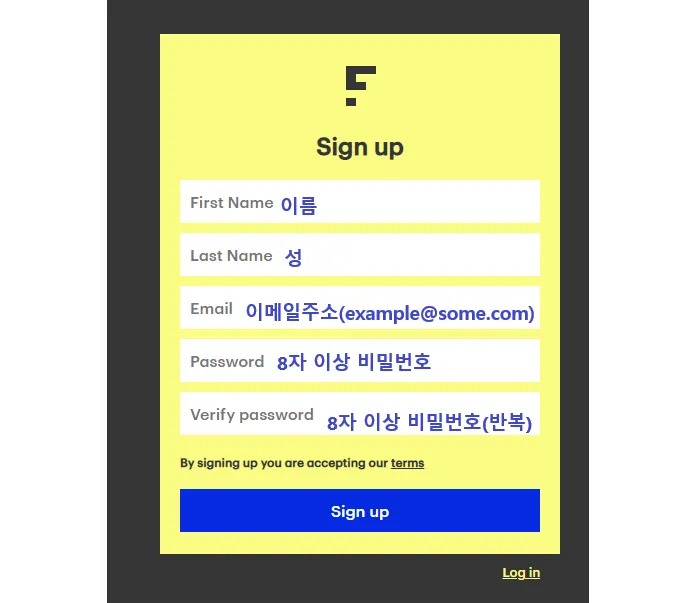 요구하는 정보를 입력하여 계정을 만들고 "Sign up"을 통해 가입합니다.