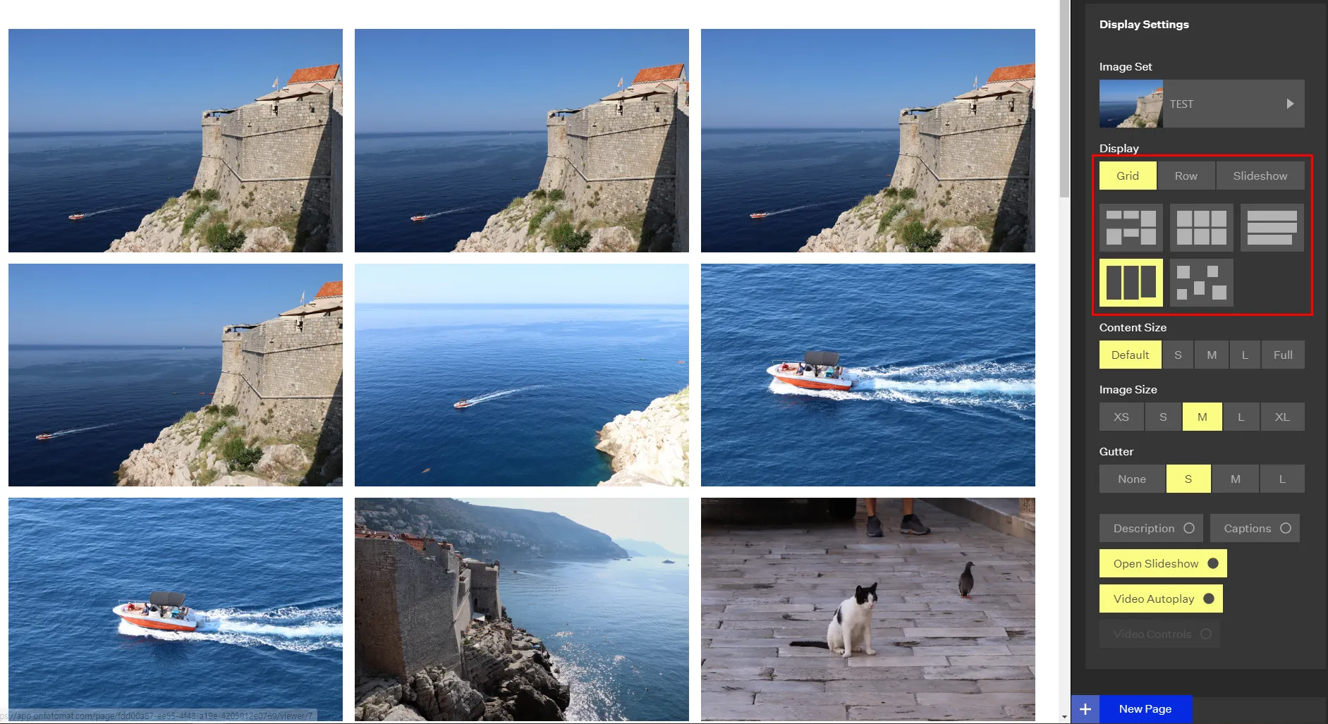 Grid는 상하 스크롤 형식으로 이미지를 배치하며, 5가지 배치방식을 제공합니다.
