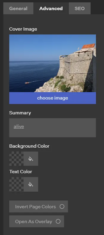 Advanced 에서는 커버이미지를 선택할 수 있으며, 이는 Images 항목에서 설정한 커버 이미지와 동일한 기능입니다.
