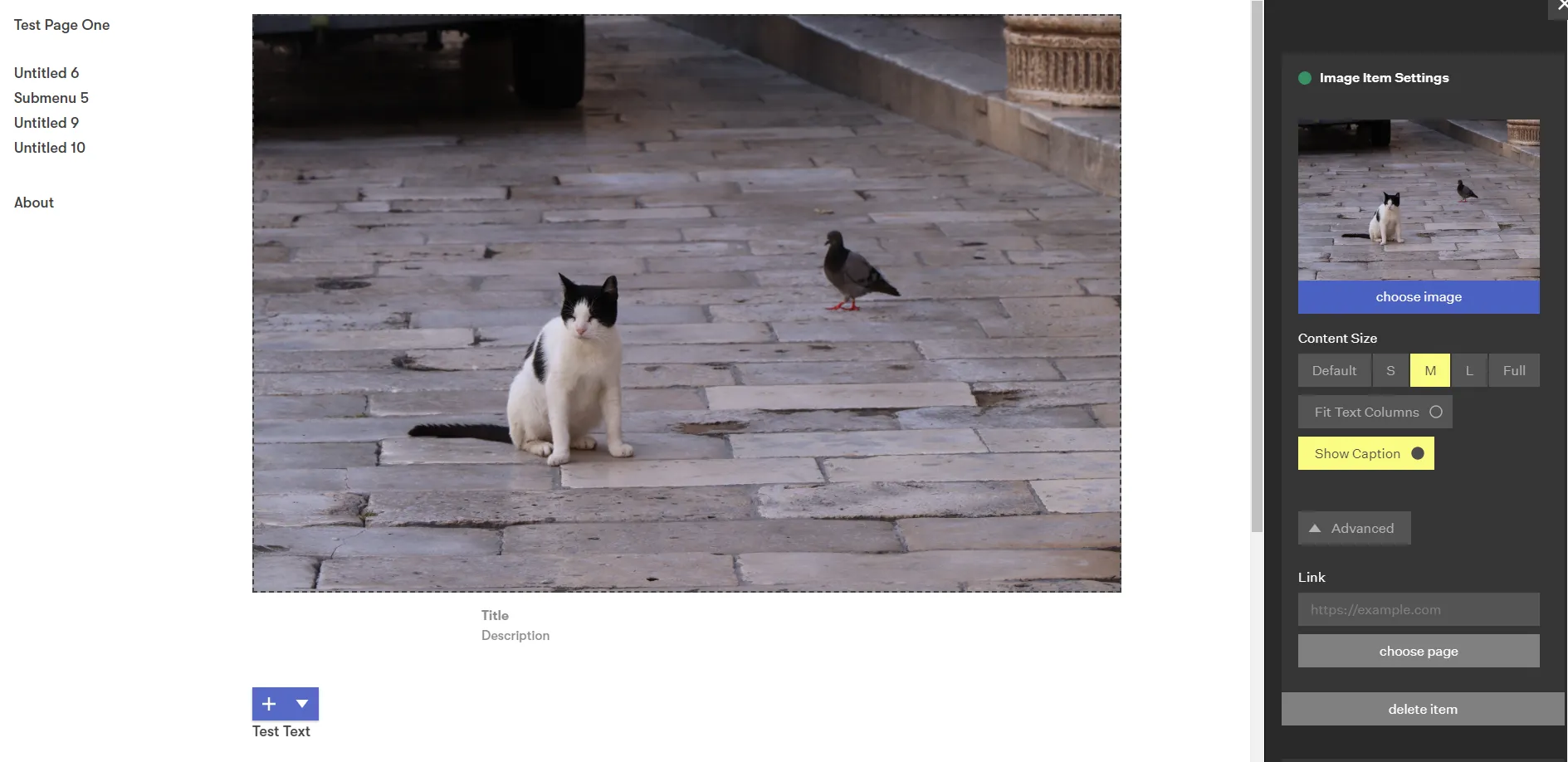 또한 Advanced 항목에서 해당 이미지를 클릭할 경우, 미리 구성한 메뉴, 컬렉션, 전시 등 내부의 다른 페이지로 링크되도록 설정할 수 있습니다. (단, 퍼블리싱을 통해 도메인을 활성화 한 경우만 작동되는 것으로 추정됩니다.)