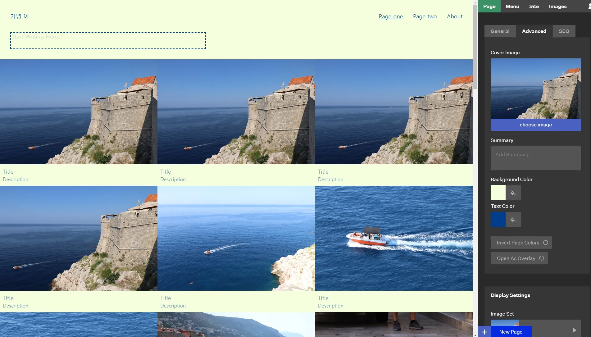 Background Color와 Text Color는 각각 배경과 텍스트의 색상을 설정하며, Background Color의 경우 Site 항목에서 제공하는 것과 같으나, 각 페이지별로 별개의 색상을 적용할 수 있도록 지원합니다.