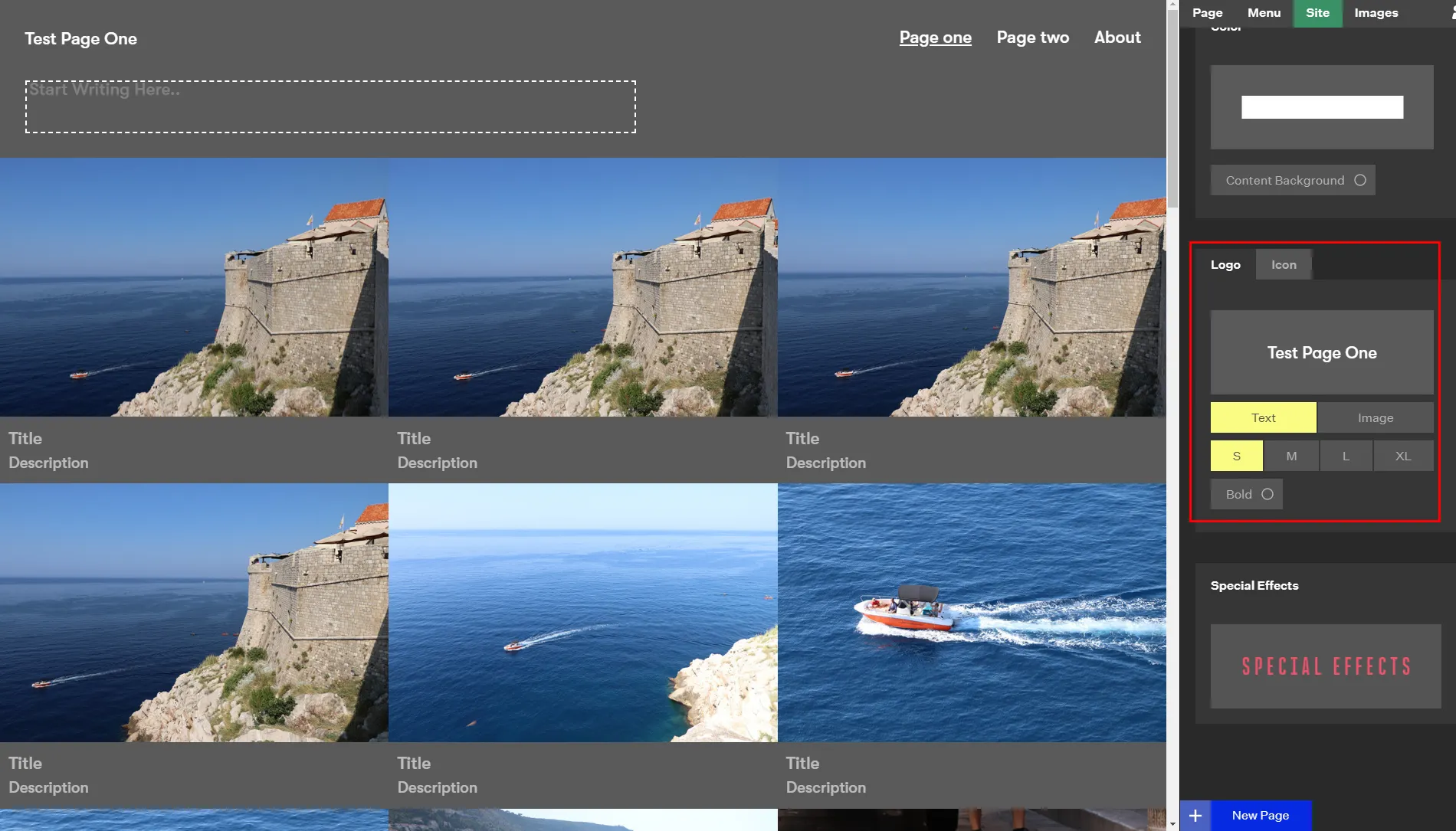 Logo는 좌측 상단의 페이지 로고를 설정하는 기능으로, 텍스트 혹은 이미지를 삽입할 수 있으며, 텍스트의 경우 위에서 설정한 폰트에 영향을 받습니다.