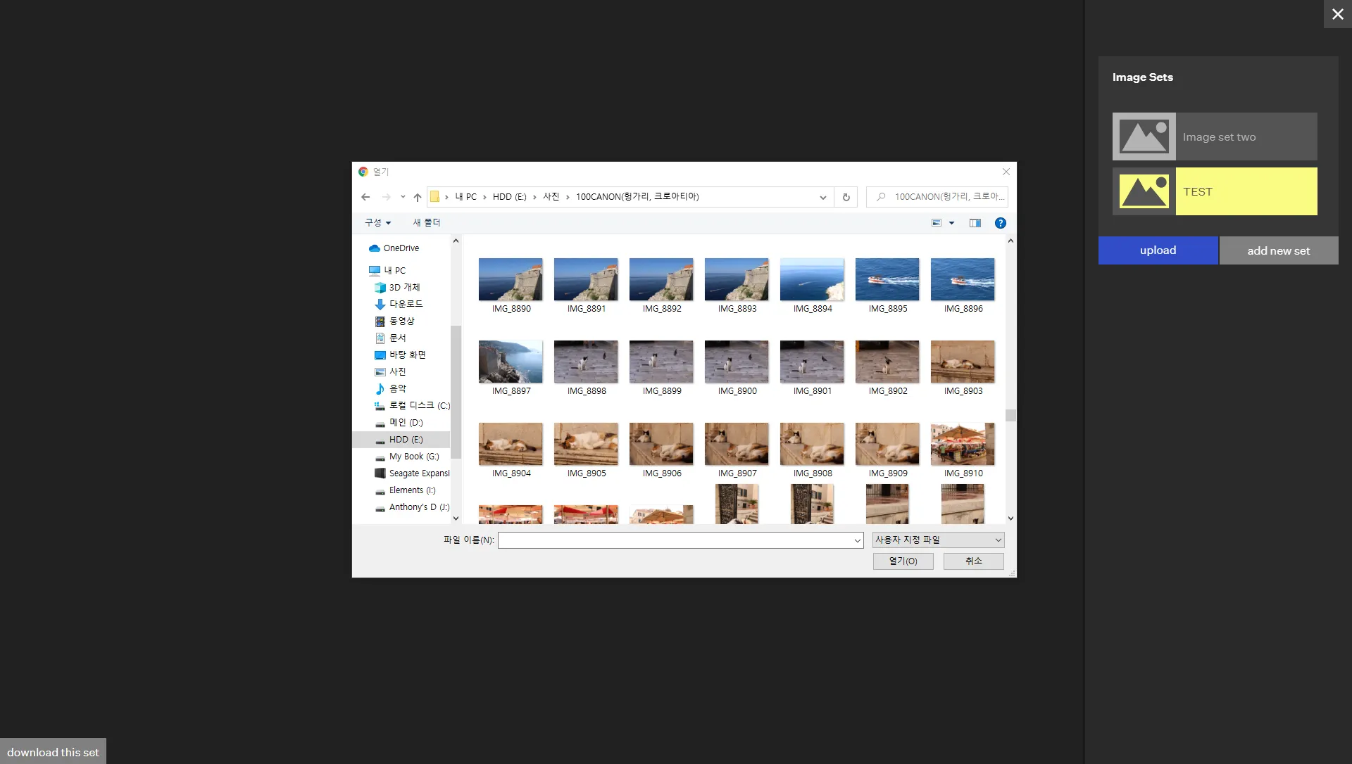 이미지와 영상을 간단하게 업로드할 수 있으며, 이미지 셋 구조로 간단한 폴더구분을 할 수 있음