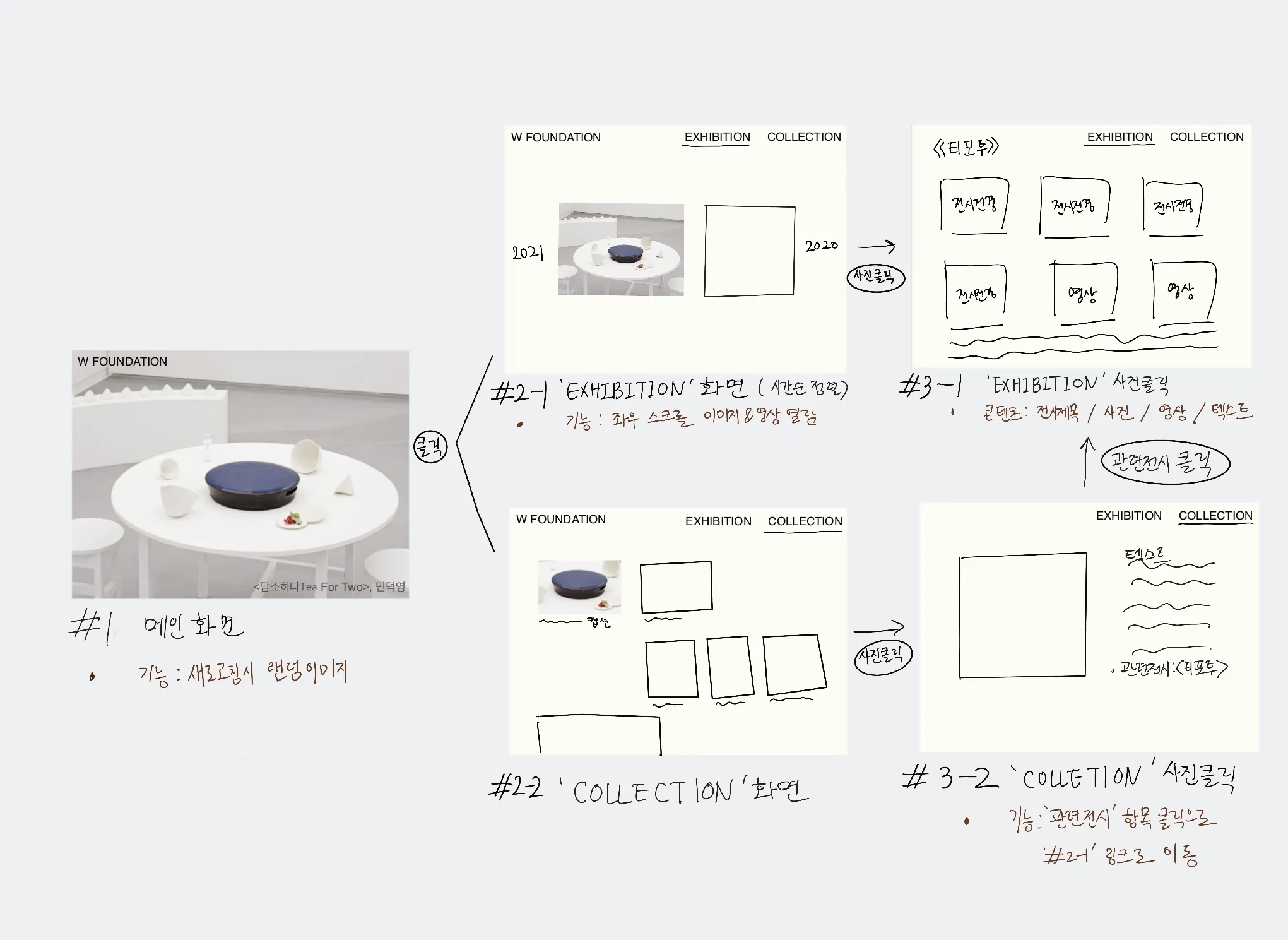 메인화면은 전시 사진 혹은 소장품 사진이 새로고침시 랜덤으로 나오는 화면입니다. 전시 사진을 클릭 시 'exhibition' 화면으로 넘어가고 소장품 사진을 클릭 시 'collection'화면으로 넘어갑니다.