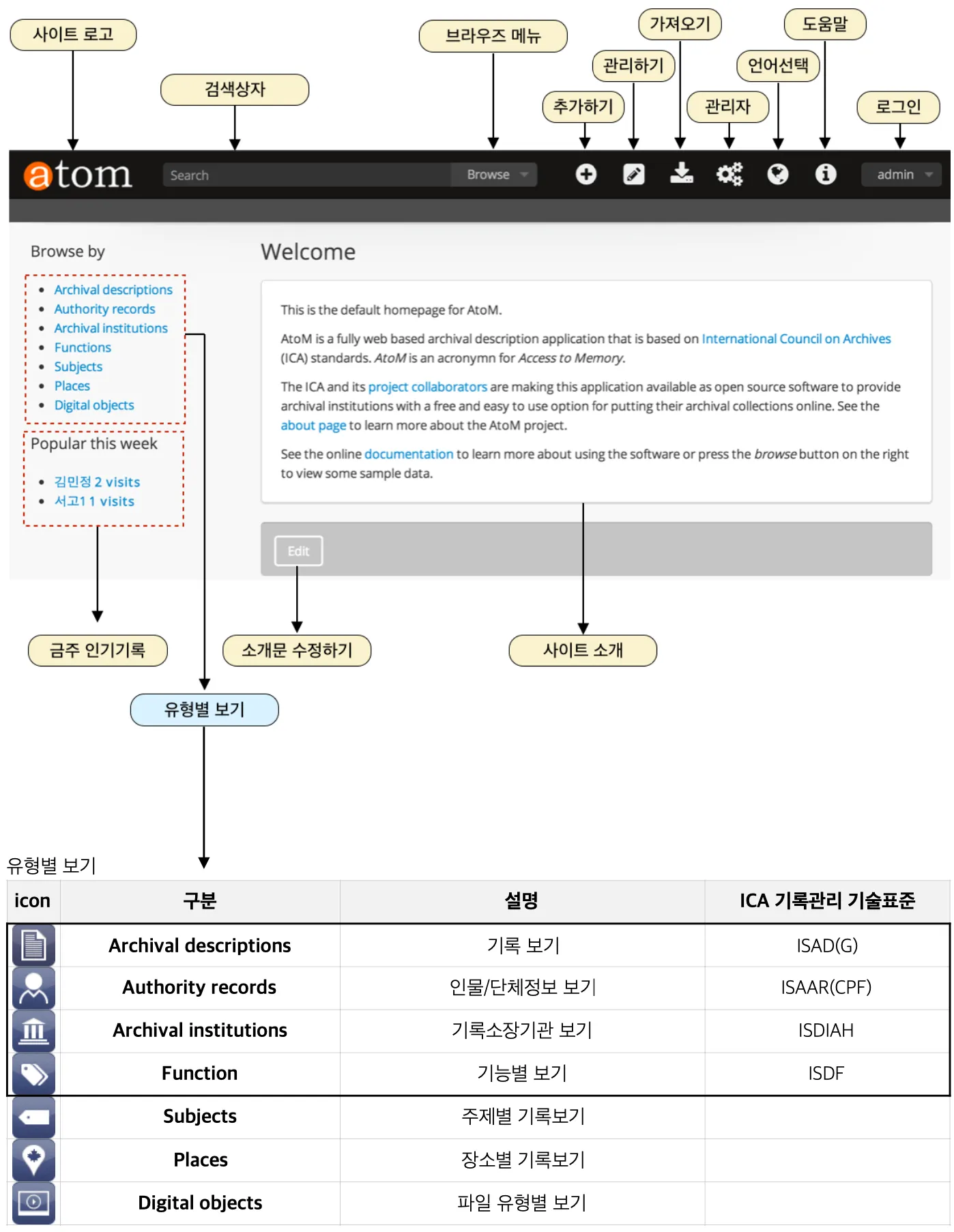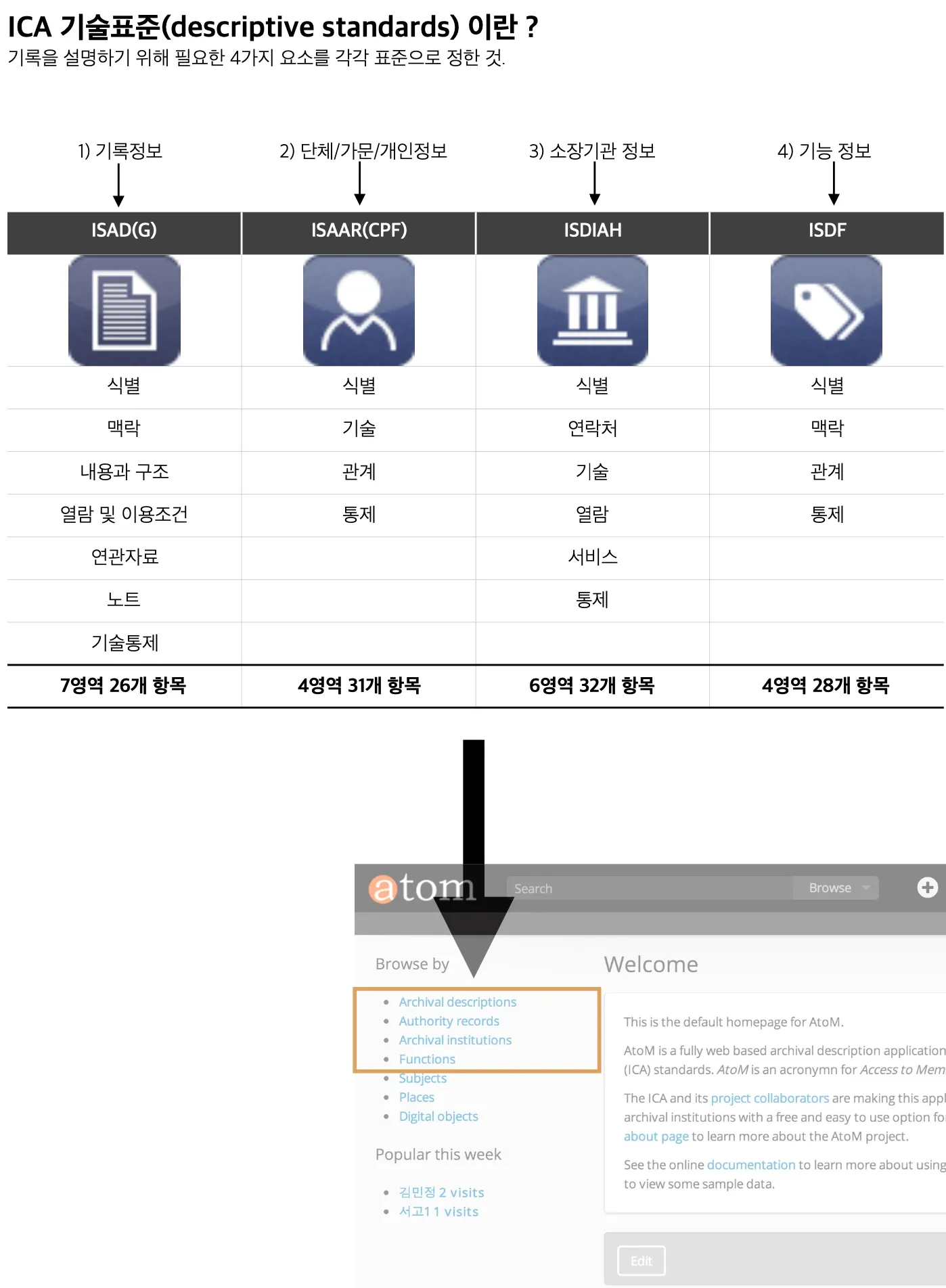 AtoM은 국제기록물기술표준 4종과 국가표준(RAD, DACS), 더블린코어(DC), MODS가 내장된 웹 기반 소장기록 기술 소프트웨어입니다.