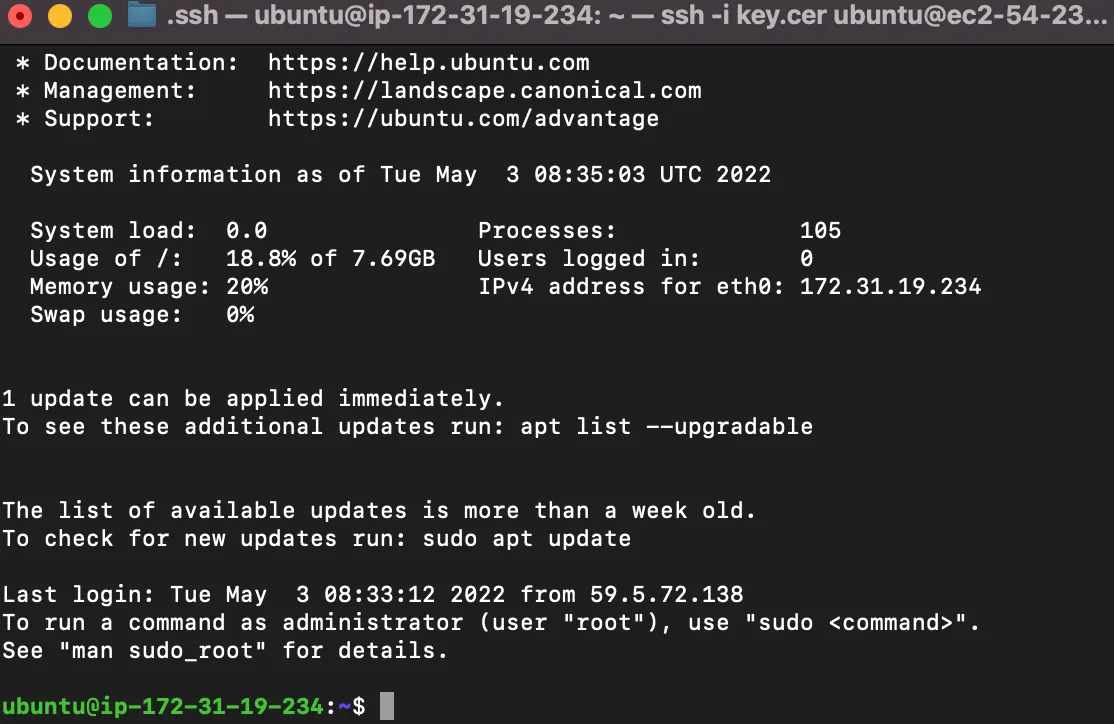 ssh -i “키 파일명.cer(혹은 pem)” ubuntu@”내 DNS 주소”