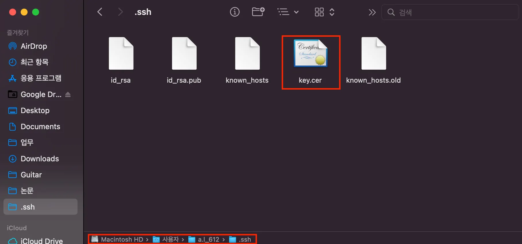 인스턴스 생성 과정에서 생산한 키 파일(.cer 혹은 .pem)을 아래 경로로 이동 혹은 복제