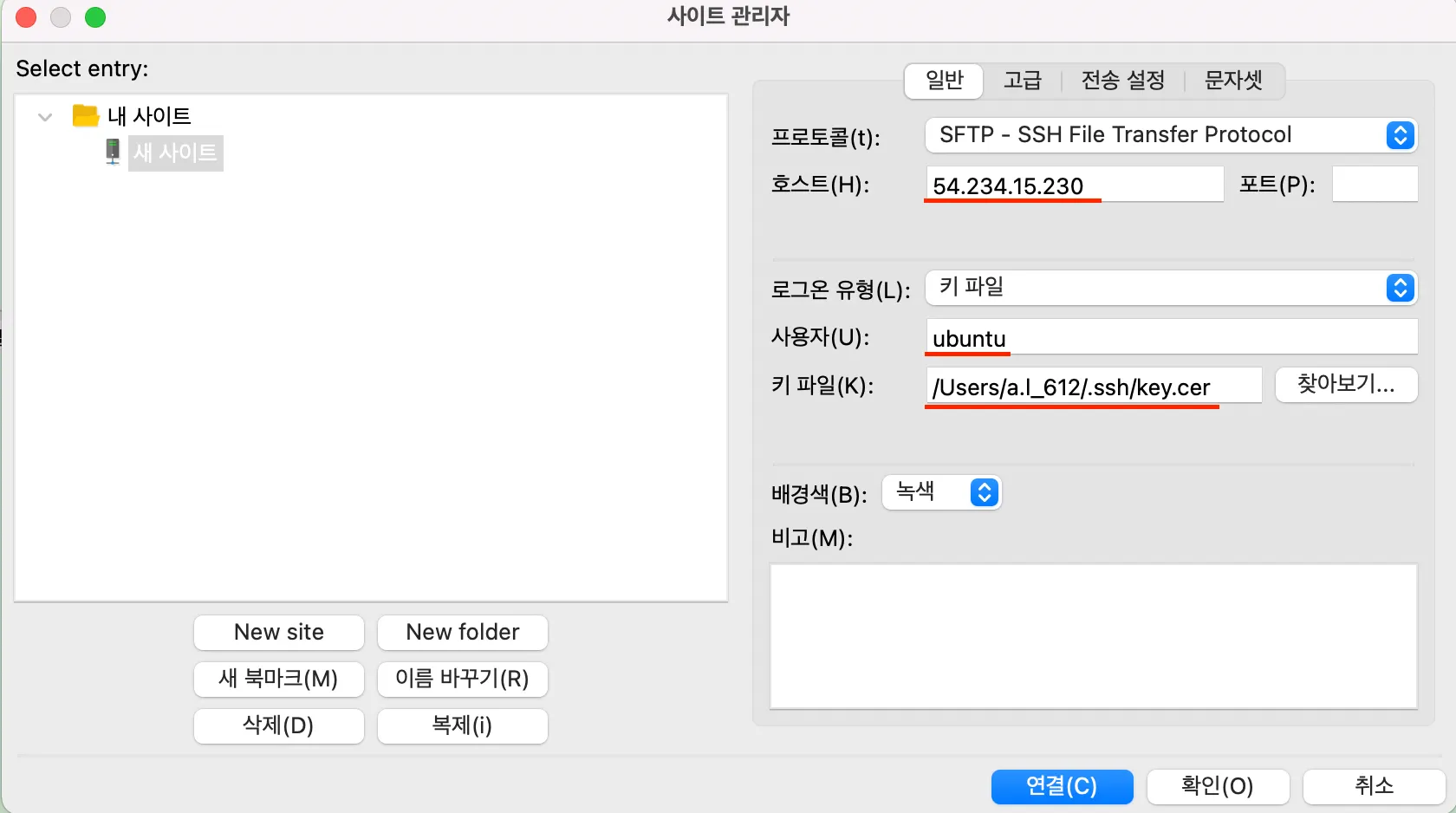 “New site” 항목을 클릭하고, 다음의 정보를 입력 후 “연결" 버튼 클릭